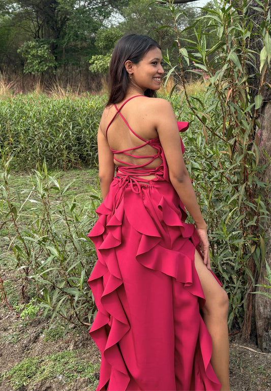 Red Sea Criss-Cross Ruffle Slit Gown